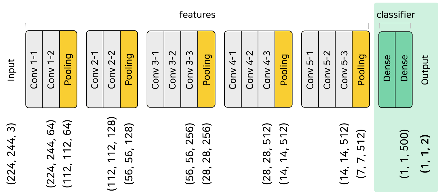 기존의 VGG16의 구조는 건들지 않았고, 가중치는 업데이트 되지 않았으므로, 추가했던 classifier 레이어의 구조만 맞춰주면 저장했던 것 그대로 읽을 수 있을 것이다.