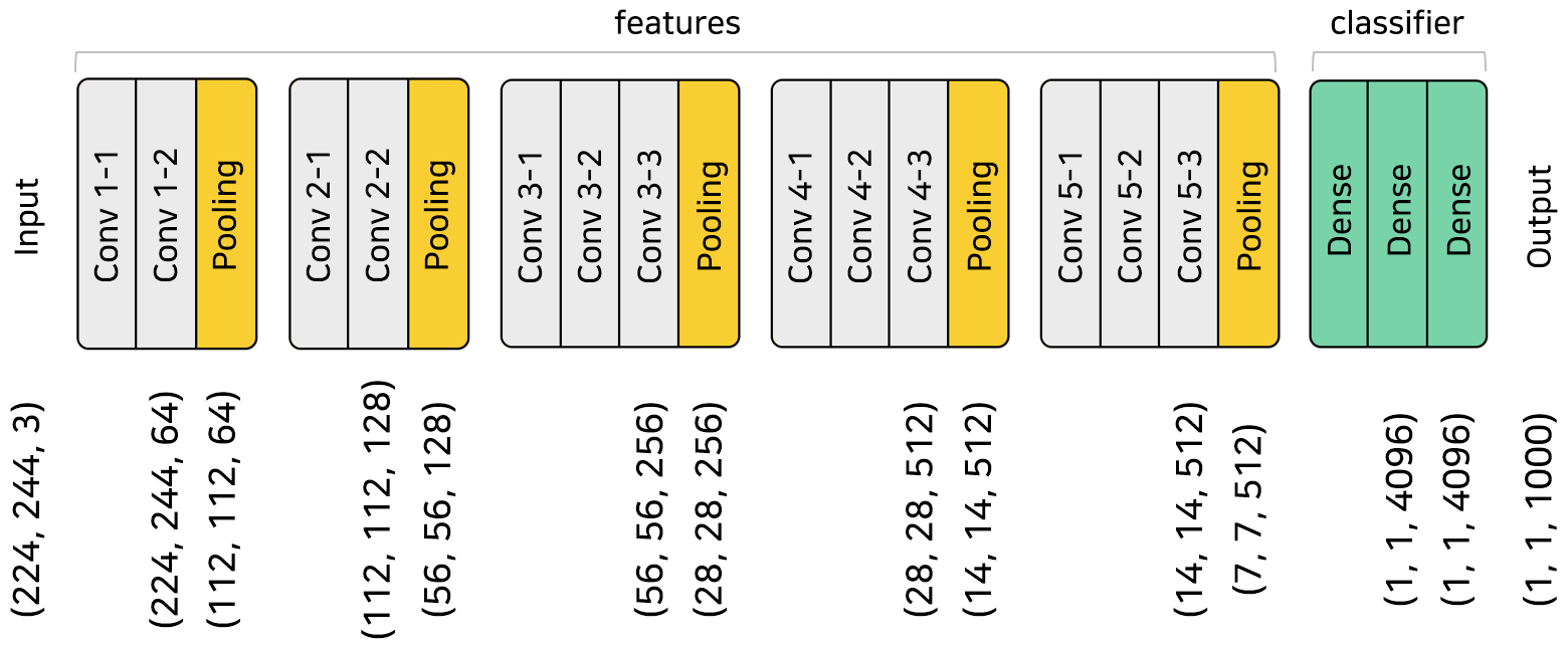 구조가 이렇기때문에, input으로 들어가는 이미지의 크기를 (224, 244)로 맞춰줘야한다. 그리고 RGB로 입력 채널은 3개.