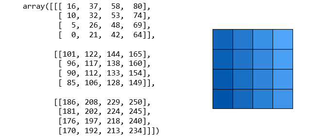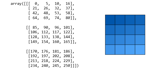 학습 데이터로 들어가는 텐서는 아래와 같이 벡터 덩어리(?)의 모습이므로, 오른쪽의 RGB 이미지도 왼쪽과 같은 (3, 4, 4) 크기의 텐서가 된다.