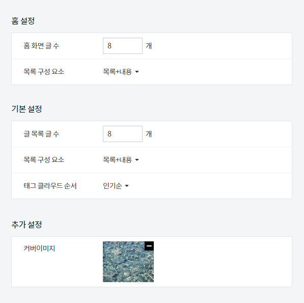 스킨 편집 페이지에서, 오른쪽에 보이는 추가 설정 섹션의 커버이미지를 클릭하여 이미지를 변경한다.