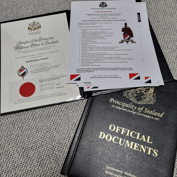 결론부터 말하자면 시랜드 공국(Principality of Sealand)에 기사 작위를 신청했고 5월 쯤 되어서 소포가 도착했다.